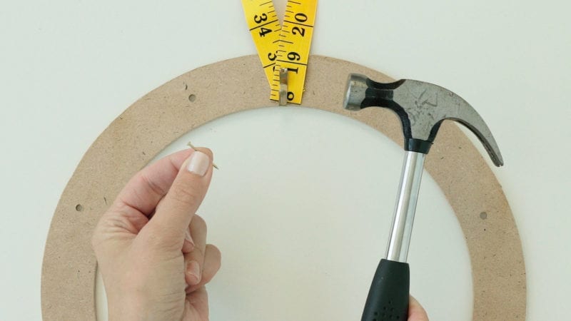 We used a record measure for hanging our wreath. The xanthous adds a nice popular of color. Just cut information technology to the length you want the wreath to hang and attach it to the wreath frame with hot glue. Y'all can also use ribbon or any other similar material that y'all prefer.