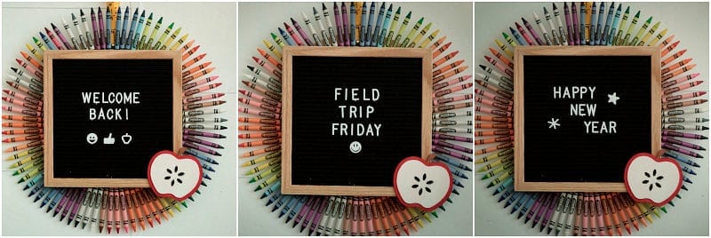 Now it's time to decorate. We've seen crayon wreaths decorated in many different means, using ribbons, messages, names, etc. Nosotros like the simplicity of the letter lath and an apple. We picked the wooden apple tree up at a local craft store so painted it. Exist sure to attach everything securely.